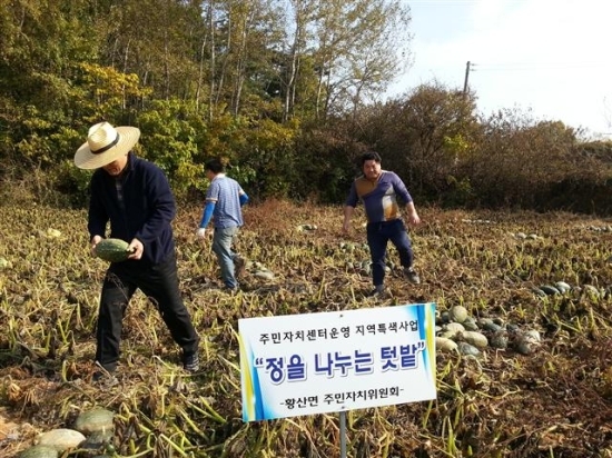 김제시 황산면 주민자치위원회(위원장 송기현)는 8일 올해 특화사업으로 추진 하고 있는 ‘정을 나누는 텃밭’에서 호박을 수확 하는 기쁨을 맛봤다.