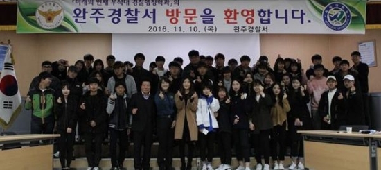 이날 완주경찰서를 찾은 우석대학생들은 경찰관 입직 경로와 경찰관이 하는 일에 대한 교육, 112종합상황실 체험 등을 가진데 이어 우석대 경찰행정학과 출신으로 완주경찰서에 근무하고 있는 유영민 경위와 강하나 순경으로부터 질의응답 시간을 가졌다.
