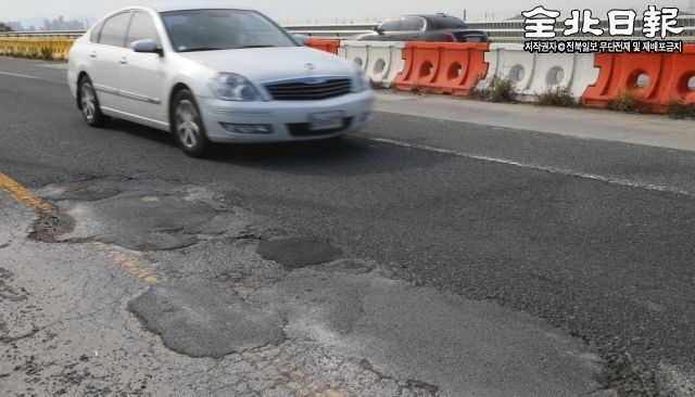 실제 지난달 30일 오후 10시 54분께 전주방면 2차로 도로에서 50cm의 노면 파손 현상이 발생, 차량 3대의 타이어가 펑크나는 사고가 발생했다. 차량 통행이 드문 시각이어서 큰 사고는 발생하지 않았지만 자칫 대형사고로 이어질 뻔 했다.