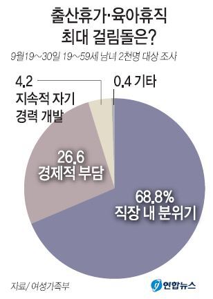 여성가족부는 전국 성인 남녀 2000명을 상대로 설문조사한 결과 육아휴직 등 일·가정 양립지원 제도를 사용하지 못하는 원인으로 응답자의 68.8%가 ‘직장 내 분위기’를 꼽았다고 21일 밝혔다.