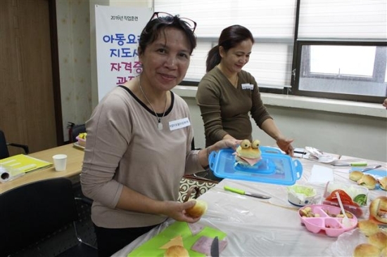 ▲ 전주시에서 실시하는 아동요리지도사 자격증 과정에 참여해 직업훈련을 받고 있는 결혼이주여성들.