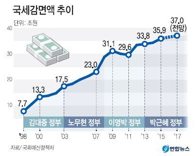 각 정권별 국세감면율을 살펴보면 김대중 정부가 평균 12%로 가장 낮았고 노무현 정부(13.2%)가 두 번째였다. 박근혜 정부는 13.9%였고, 이명박 정부는 15%로 가장 높았다. 이명박 정부 기간 금융위기 등으로 경기부양성 조세지원이 늘어났기 때문이라는 설명이다. 연합뉴스