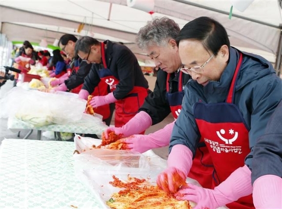 ▲ 지난 26일부터 이틀간 임실고추가공센터에서 ‘제1회 임실아삭아삭 김장 페스티벌’이 열린 가운데, 심민 임실군수를 비롯한 군 관계자들이 김장 체험을 하고 있다.