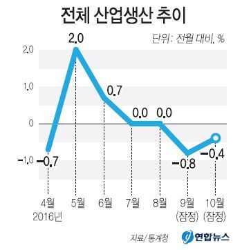 전체 산업생산은 7∼8월 두 달 연속 보합세를 보이다가 9월(-0.8%)부터 마이너스로 고꾸라졌다. 전체 산업생산이 2개월 연속 감소한 것은 지난해 10∼11월 이후 1년만이다.