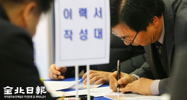 도내 선도기업 구인·구직 현장 면접이 실시된 지난 30일 전북테크노파크에서 구직자들이 이력서를 작성하고 있다.