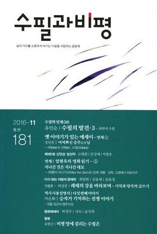 △삶의 가치를 소중하게 여기는 수필을 사랑하는 공동체 ‘수필과비평사’는 <수필과비평〉통권 181호를 펴냈다. 제181호 신인상을 수상한 고대관 김성애 서병호 씨 당선작과 ‘다시 읽는 이달의 문제작’인 최원현 김윤재 문윤정의 글이 실렸다. 수필학 연재에서는 유인순 씨의 ‘수필의 발견3-과학적 수필’이, 옛 이야기가 있는 에세이에는 정진권 ‘어여쁘신 공주님’이 게재됐다. 엄현옥의 영화읽기 코너에는 올해 개봉한 고레에다 히로카즈 감독의 ‘태풍이 지나가고’가 소개됐다.< p>