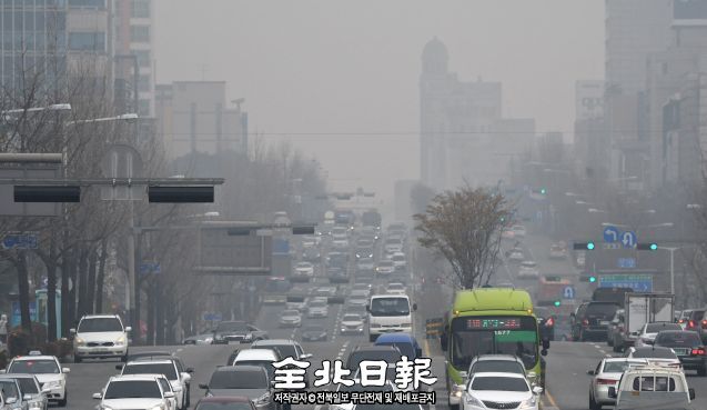 5일 도내 전지역의 미세먼지 농도가 '나쁨'인 가운데 백제로에서 바라본 전주역 방향이 미세먼지로 가득하다.