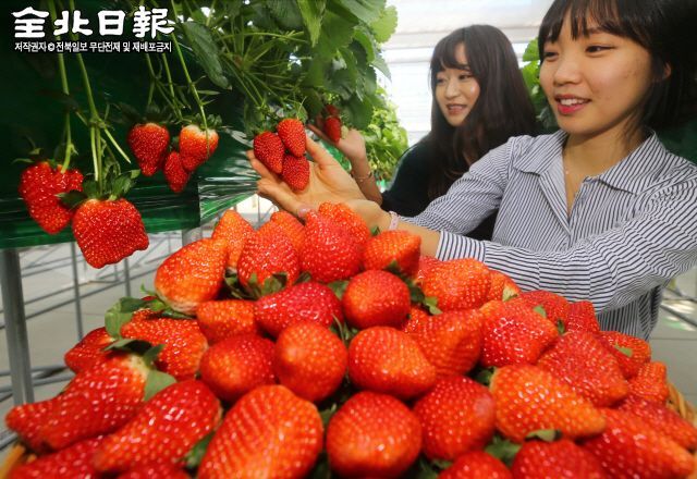 6일 농촌진흥청 국립원예특작과학원 온실에서 연구원들이 품종 개발을 위해 재배중인 딸기를 수확하고 있다.