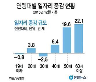 반면 20∼30대는 증가 폭이 미미하거나 오히려 감소했다. 20대 일자리는 3만8000개(1.3%) 늘어났지만 30대에선 오히려 2만5000개(0.5%) 줄었다.