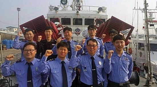 ▲ 역사의 뒤안길로 사라질 군산해경 소속 특수목적 ‘방제8호정’ 승조원들이 퇴역을 앞둔 경비함정에서 파이팅을 외치며 기념촬영을 하고 있다.