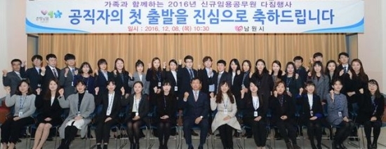 ▲ 8일 남원시청 강당에서 열린 ‘2016년 신규 임용된 공무원 다짐행사’에서 남원시 새내기 공무원들이 첫 출발에 앞서 파이팅을 외치고 있다.