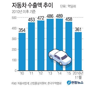 12월에 해외 판매가 회복되더라도 올해 전체 자동차 수출액은 작년의 458억 달러에 못 미치는 400억 달러 안팎 수준에 머물 것으로 예상된다. 연합뉴스