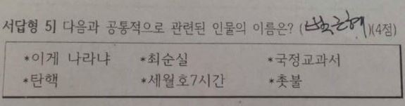 이 시험지의 서답형 5번 문제에는 ‘다음과 공통적으로 관련된 인물의 이름은?’이라는 문제 아래 ‘이게 나라냐·최순실·국정교과서·탄핵·세월호 7시간·촛불’이라는 보기가 적혔다.