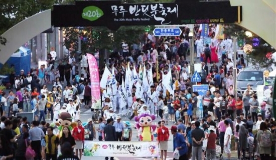 ▲ 지난 8월 무주군 지남공원에서 열린 2016무주반딧불축제 개막식을 축하하는 길놀이 모습.