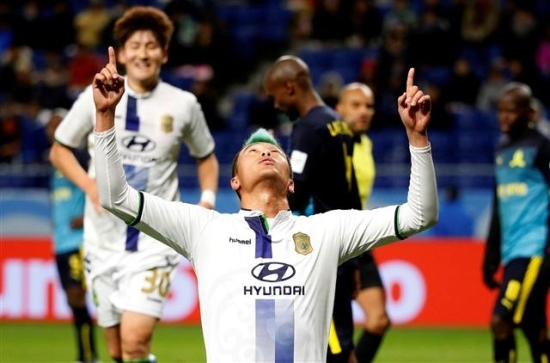 ▲ 남아공의 마멜로디 선다운즈와의 클럽월드컵 5-6위 전에서 후반 32분 투입된 전북현대의 김신욱이 골을 성공시킨 후 환호하고 있다. 연합뉴스