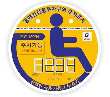장애인 주차가능표지는 현재 직사각형 형태이지만 내년 1월부터 원형으로 바뀌며, 장애인 주차구역에 주차하기 위해서는 반드시 새로운 주차가능(노란색 원형) 표지로 교체해야 한다.