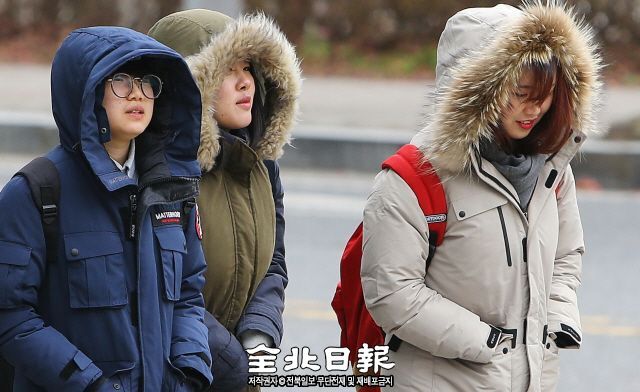 장수군의 아침 최저기온이 영하 6도를 기록하는 등 기온이 큰 폭으로 내린 14일 전북대학교에서 털모자를 쓴 대학생들이 주머니에 손을 넣고 발걸음을 옮기고 있다.