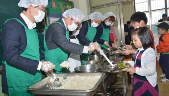 ▲ 순창 금과면 태이영농조합법인의 친환경 쌀 ‘희망햇쌀’이 서울시 금천구 소재 학교의 급식쌀 납품업체 중 하나로 선정된 가운데, 박원순 서울시장과 황숙주 순창군수가 한 초등학교의 교실에서 학생들에게 배식을 하고 있다.