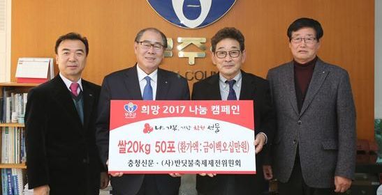 충청신문 김충헌 대표는 지난 16일 무주군을 찾아 쌀 50포대(250만 원 상당·1포대 20kg)를 기탁했다.