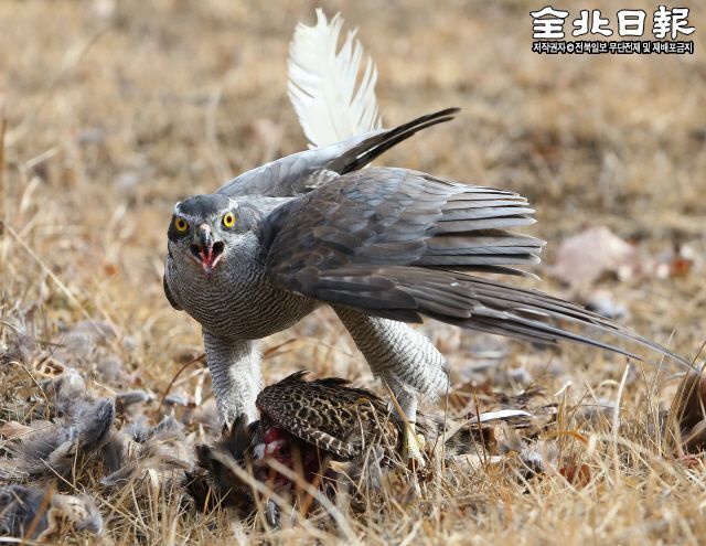 유네스코 세계무형유산으로 등재된 ‘매사냥’시연행사가 열린 지난 17일 진안군 백운면의 한 야산에서 참매 한 마리가 꿩을 사냥하고 있다.