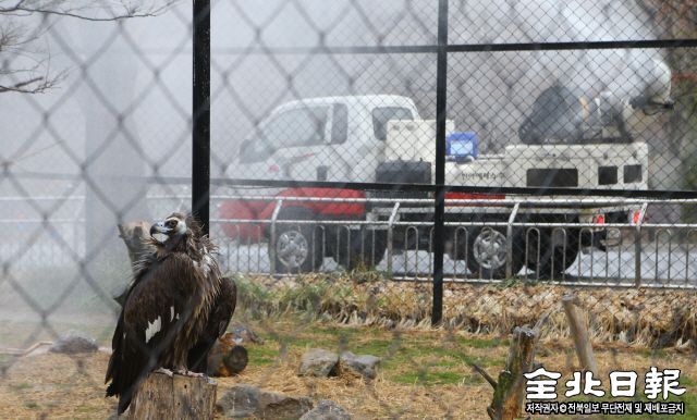 서울대공원 동물원에서 폐사한 황새와 원앙에서도 조류 인플루엔자가 발생하는 등 조류 인플루엔자가 전국적으로 확산되고 있는 19일 전주 동물원에서 방역차를 이용해 조류 사육장을 방역하고 있다.