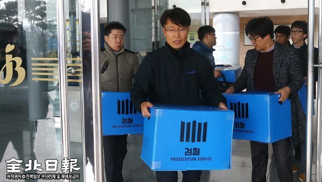 전주지방검찰청이 김승환 전북교육감의 인사 전횡 의혹과 관련해 20일 교육청에 대한 압수수색을 실시한 가운데 검찰 관계자들이 압수품이 담긴 상자를 가지고 교육청을 나서고 있다.