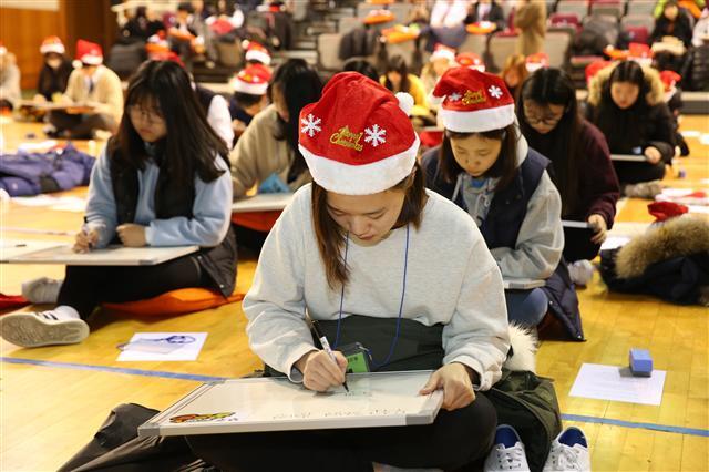 ▲ 제6회 무주 도전 골든벨 대회가 열린 지난 21일 무주 예체문화관에서 한 학생이 화이트보드에 답을 적고 있다.