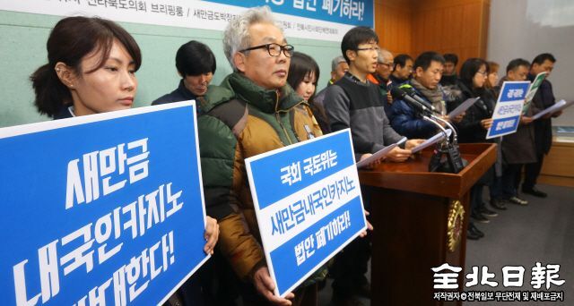 ‘새만금도박장저지군산범시민대책위원회’와 ‘전북시민사회단체연대회의’는 27일 전북도의회에서 기자회견을 열고 “국회 국토교통위원회가 보류 처리한 ‘새만금사업추진및지원에관한특별법’ 일부개정안은 당장 폐기해야 마땅하다”고 밝혔다.