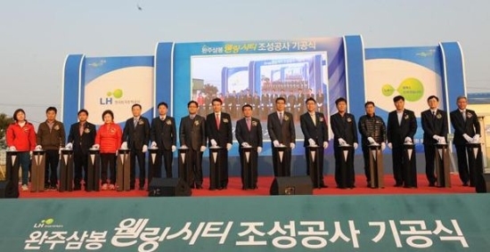 ▲ 완주 삼봉웰링시티 조성 사업 기공식이 지난달 4일 오후 4시 삼례읍 수계리 현지에서 박성일 완주군수와 LH공사 박수홍 이사 등 500명이 참석한 가운데 열렸다