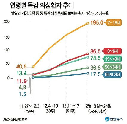 질병관리본부는 독감 표본감시 결과 52주차(2016년 12월 18일~2016년 12월 24일) 독감 의사환자(발열과 기침, 인후통 등 독감 의심증세를 보이는 환자)가 1000명당 86.2명으로 잠정 집계됐다고 29일 밝혔다. 연합뉴스