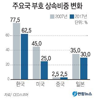 상속형 부자 비중이 가장 높은 나라는 한국이다. 우리나라는 40명 중 25명이 상속형 부자로 비중이 62.5%에 달했다. 연합뉴스