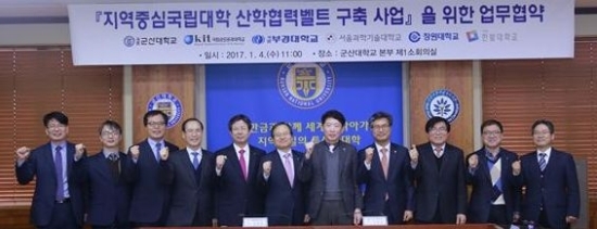 군산대학교는 4일 군산대를 비롯해 한밭대, 금오공대, 부경대, 서울과기대, 창원대 등 지역중심 6개 국립대학이 참석한 가운데 ‘지역중심국립대학 산학협력벨트 구축사업’을 위한 제 2차 실무책임자회의를 개최하고, 성공적 사업수행을 위해 협약을 체결했다.