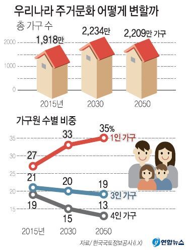 보고서는 2050년에는 우리나라 가구의 35%가 1인 가구일 것으로 예측했다. 인구는 2030년에 정점을 찍고 이후 줄어드는 데 비해 1~2인 가구가 늘어나는 가구분화는 계속 진행되기 때문이다.