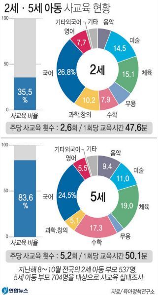 9일 육아정책연구소의 육아정책 브리프 ‘영유아의 사교육 노출, 이대로 괜찮은가’ 보고서에 따르면 우리나라 2세(이하 만 나이) 아동과 5세 아동의 사교육 비율이각각 35.5%, 83.6%에 달했다.