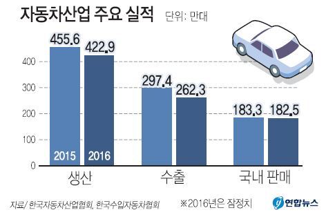 산업통상자원부는 2016년 자동차산업 실적을 잠정 집계한 결과 연간 수출량은 262만3000대로 전년보다 11.8% 줄었다고 10일 밝혔다. 금액 기준으로는 11.3% 감소한 406억 달러에 그쳤다.