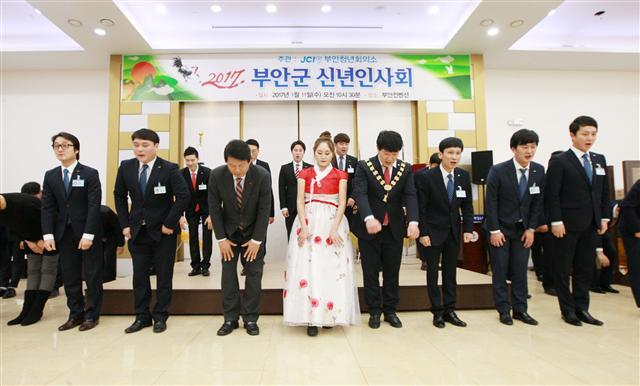 이날 신년인사회는 1부 상견례 및 부안관광영상 시청과 2부 기념행사는 개회와 국민의례, 군민헌장 낭독, 기념사, 신년인사, 세배, 축하떡자르기, 폐회 순으로 열렸다.