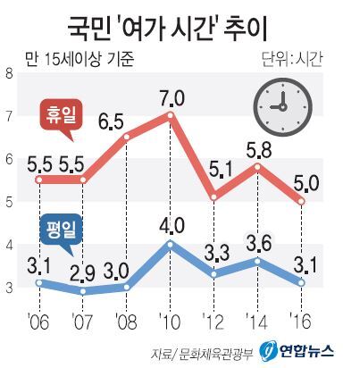 문화체육관광부가 12일 발표한 ‘2016 국민여가활동조사’에 따르면, 지난해 우리나라 국민들의 평일 여가 시간은 평균 3.1시간, 휴일 여가 시간은 5.0시간으로 조사됐다. 이는 직전 조사인 2014년의 3.6시간, 5.8시간에 비해 모두 감소한 것이다.