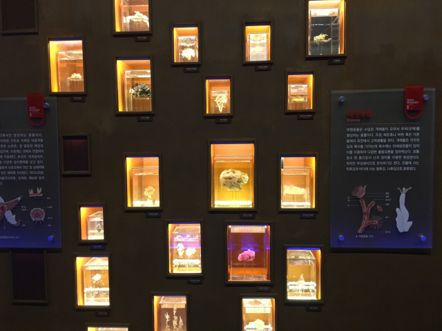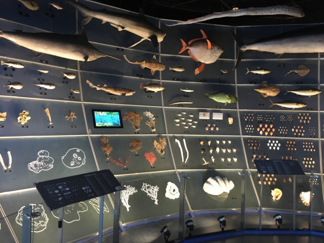 특히 ‘살아있는 화석’으로 불리는 투구게와 앵무조개를 비롯해 비단군부·털군부·따가리 등은 관람객들의 호기심을 자극한다. 립스틱 원료로 사용되는 흰이빨참갯지렁이, 200v 전기를 생산하는 전기가오리 등 생물에 얽힌 이야기도 흥미롭다. 포유류 코너에는 상어, 가오리 등과 함께 까치상어의 출산 장면을 고스란히 보여 주는 표본도 발견할 수 있다.