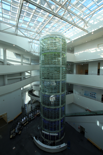 국립해양생물자원관 입구에 들어서면 가장 눈길을 끄는 것은 건물 한가운데 있는 기둥이자 유리로 만든 타워형 시드 뱅크(Seed Bank)다. 높이 24.7m에 이르는 유리 구조물 안에 우리나라 바다에 서식하는 해양 생물의 표본 5000여 점을 쌓아 올린 국립해양생물자원관의 상징물이다. 특히 총 4개 층으로 구성된 전시공간은 일반적인 전시관과는 차이점이 있다. 관람 동선의 시작이 1층이 아니라 가장 위층인 4층부터 시작된다는 사실이다.