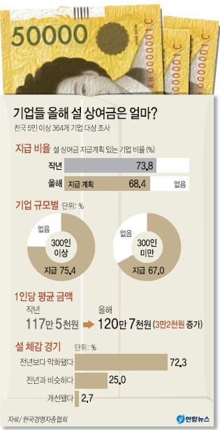 기업 10곳 중 7곳이 올해 설 상여금을 지급할 계획이 있는 것으로 나타났다. 다만 경기 악화로 상여금을 지급하는 기업은 작년보다 줄어들었다. 올해 설 상여금 평균 지급 액수는 120만 7000원으로 조사됐고, 기업들의 올해 설 연휴 일수는 평균 4.1일로 작년보다 0.5일 줄어들 전망이다.