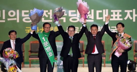 ▲ 15일 경기도 고양 킨텍스에서 열린 국민의당 전당대회에서 박지원 신임 대표(가운데)가 황주홍(왼쪽부터), 문병호,박지원 신임대표, 김영환, 손금주 후보와 함께 손을 들어보이고 있다. ·연합뉴스