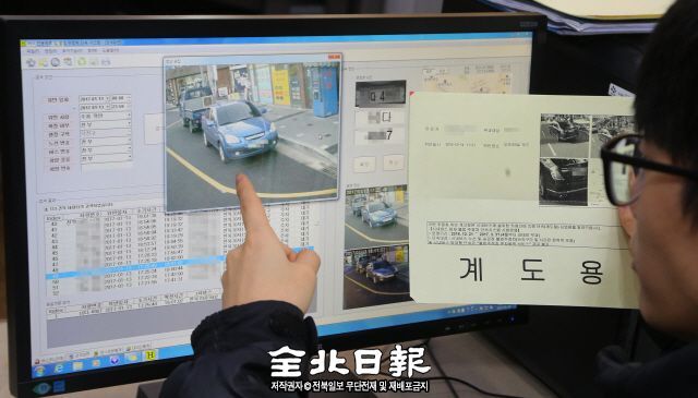 #. 16일 오전 9시 50분 전주시 덕진구청 경제교통과 전산실. 책상 한쪽에서 최근 시행 중인 시내버스 탑재 불법 주정차 단속 현황을 확인할 수 있었다. 모니터 속에는 ‘버스 전용차로 및 불법 주정차 단속 시스템’이라는 프로그램이 실행 중이었다. 전주시 곳곳의 노선이 색깔별로 표시돼 있었고, 현재 버스가 어느 위치를 지나고 있는지 확인할 수 있었다. 다른 창을 열자 시내버스에 달린 고성능 카메라에서 수집한 불법 주정차 자동차 번호판 사진이 전송되고 있었다. 이날 오전 7시부터 집계를 시작해 8시가 조금 넘은 시각까지 적발된 불법 주정차 차량은 모두 54대로 차량 번호와 번호판 사진이 자동으로 집계되고 있었다.