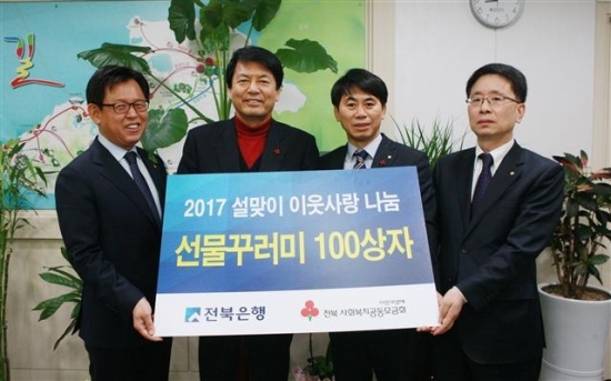선물꾸러미에는 전북은행 임직원들의 이웃사랑의 마음과 함께 라면, 참치, 식용유, 간장, 당면, 김 등 생필품 총 9종이 담겨 있다.