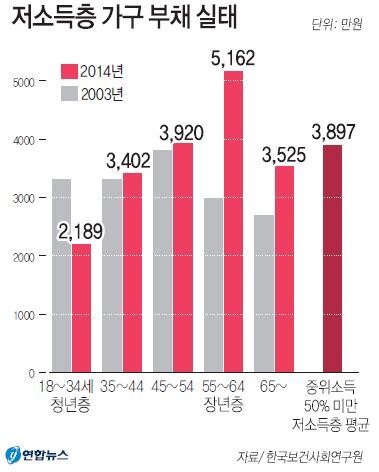 19일 한국보건사회연구원 김태완 연구위원의 ‘저소득층 빈곤환경 실태와 자활지원 연계 방안’ 보고서에 따르면 2014년 기준으로 중위소득의 50% 미만인 저소득층 가구의 26.8%는 부채를 갖고 있었다. 연합뉴스