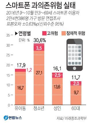 미래창조과학부와 한국정보화진흥원은 만3∼69세 스마트폰 이용자 2만4386명(1만 가구)을 대상으로 ‘2016년 인터넷(스마트폰) 과의존 실태 조사’를 벌인 결과 이같이 나타났다고 22일 밝혔다.