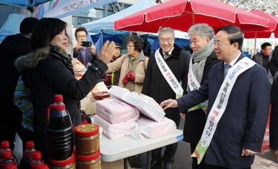 ▲ 지난 20일 심민 임실군수를 비롯한 군 관계자들이 서울서 진행되고 있는 ‘설맞이 임실군 농·특산물 홍보 판매전’을 찾아 관계자를 격려하고 있다.