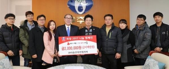 ▲ 23일 (주)다솜건축인테리어에서 무주군에 성금 200만원을 기탁하고 황정수 군수와 기념촬영을 하고 있다.