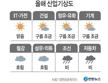 산업기상도는 맑음(매우좋음)-구름조금(좋음)-흐림(어려움)-비(매우 어려움) 4단계로 표현된다. ‘맑음’으로 관측된 업종은 IT·가전뿐이었다. 건설, 정유·유화, 기계 등 3개 업종은 ‘구름조금’, 철강과 섬유·의류 등 2개 업종은 ‘흐림’, 조선과 자동차 등 2개 업종은 ‘눈 또는 비’로 예상된다.