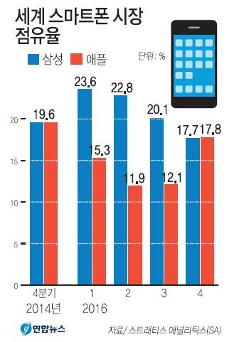 SA는 삼성전자의 세계 스마트폰 시장 점유율이 17.7%에 그쳐, 최근 6년래 최저수준을 기록한 것으로 보인다고 덧붙였다. 이로써 삼성전자는 아이폰7으로 역대 최고 판매를 기록한 애플에 세계 1위 자리를 빼앗겼다. 연합뉴스