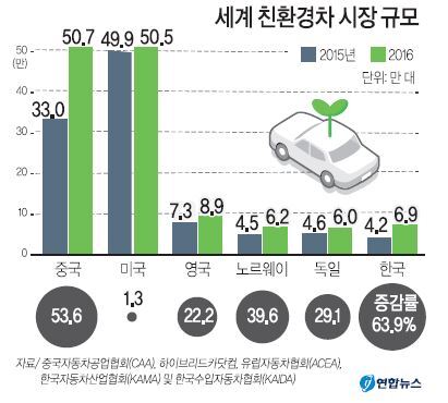 6일 중국자동차공업협회(CAA)에 따르면, 작년 중국 친환경차 시장은 처음으로 연간 50만대를 돌파하며 2015년(33만대)보다 50% 이상 증가한 50만7000대를 기록했다. 이로써 중국은 지난 한 해 동안 50만5284대의 친환경차가 판매된 미국 시장(미국 하이브리드카닷컴 통계 기준)을 근소한 차이로 제치고 단일국 기준 1위에 올랐다. ‘친환경차 종주국’이라 할 수 있는 미국 시장의 성장이 최근 수년간 주춤한 사이 전기차를 중심으로 중국 시장이 급격히 성장하면서 순위가 뒤바뀐 것이다. 연합뉴스